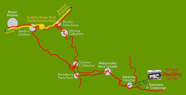 Die Paolinahütte liegt am Fuße der Rotwand, oberhalb des Karerseegebietes, an der Bergstation des Sesselliftes Paolina. Sie ist vom Karerpass und von der Nigerstraße aus über bequeme Wanderwege erreichbar.